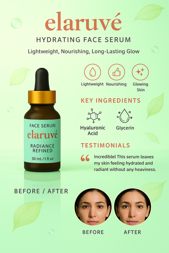 Born from the belief that beauty is eternal, elaruvé blends the elegance of nature with the precision of advanced skincare science. Our face serum is crafted to restore radiance, smooth fine lines, and reveal the confident glow you were meant to shine.